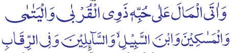 അവർ ധനത്തോടുള്ള സ്നേഹം നിലനിൽക്കേ അടുത്ത ബന്ധു ക്കൾക്കും യത്തീമുകൾക്കും മിസ്ക്കീനുകൾക്കും യാത്രക്കാർക്കും യാചകർക്കും കഴുത്തുകൾ സ്വതന്ത്രമാക്കുന്നതിനും ധനം നൽകുന്നു. അഥവാ അടിമകളെ മോചിപ്പിക്കുന്നതിനായി. ഈ ആയത്തിന്റെ തുടക്കത്തിൽ ഉള്ള വിഷയം മുമ്പിൽ വെക്കുകയാണെങ്കിൽ ഇവിടെ പറയുന്നത് ഇതെല്ലാം അതിമഹത്തായ നന്മകളാണെന്നാണ്.
